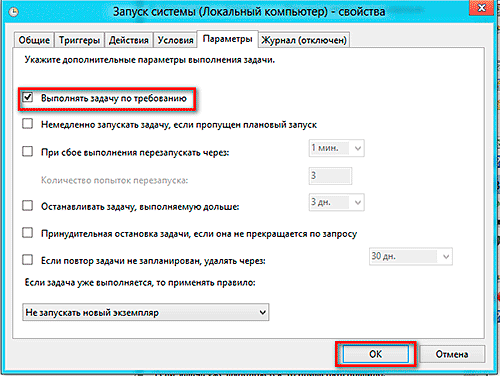 Во вкладке «Параметры» убрать все галки кроме строки «Выполнять задачу по требованию». Кнопка «Ок».