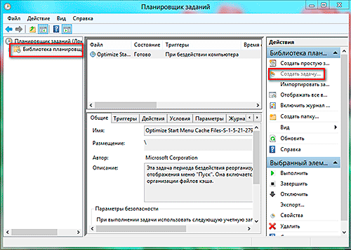 Перейти в «Библиотеку планировщика заданий» и «Создать задачу».