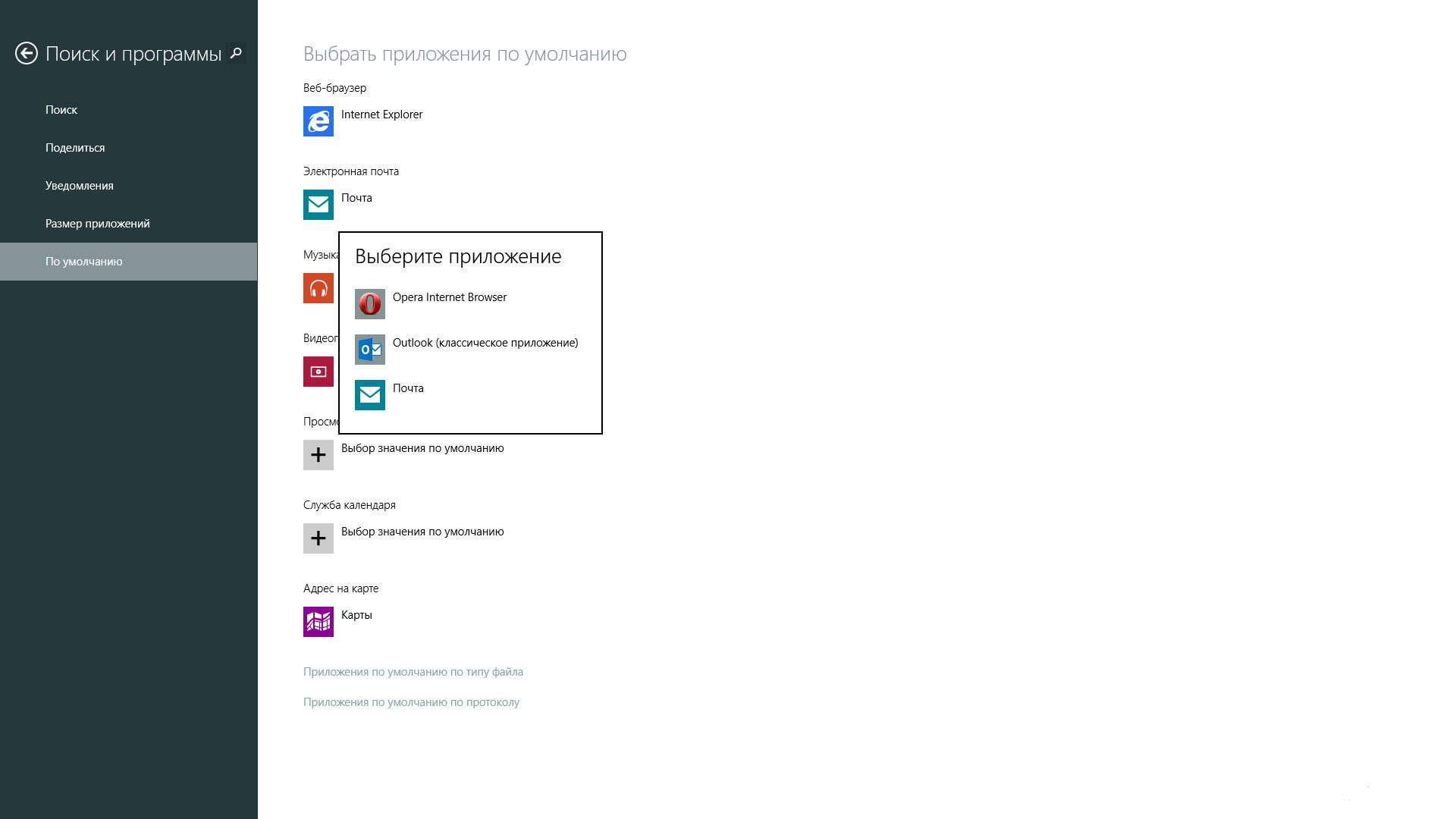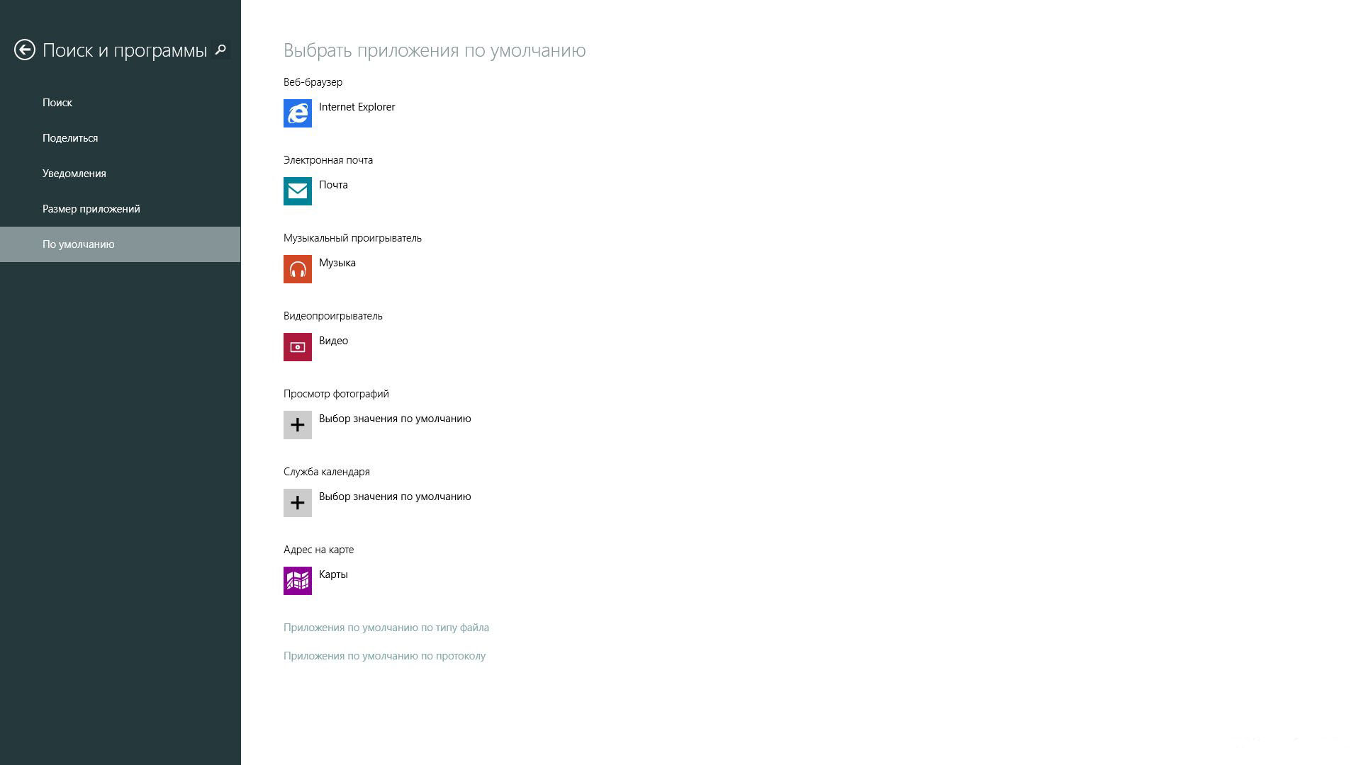 Необходимые настройки расположены в разделе Поиск и программы → По умолчанию в панели «Параметры ПК». На главной странице раздела, приложения которые, планируется использовать по умолчанию, можно выбрать приложения для просмотра фотографий, календаря и карт, браузер, почтовую программу, аудио и видеоплееры. На выбор доступны, как классические программы, так и приложения магазина Windows.