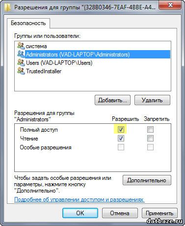 - Если флажок "Полный доступ” доступен, поставьте его и нажмите на кнопку "ОК”. Если группа владелец раздела, возможно, этого будет достаточно.