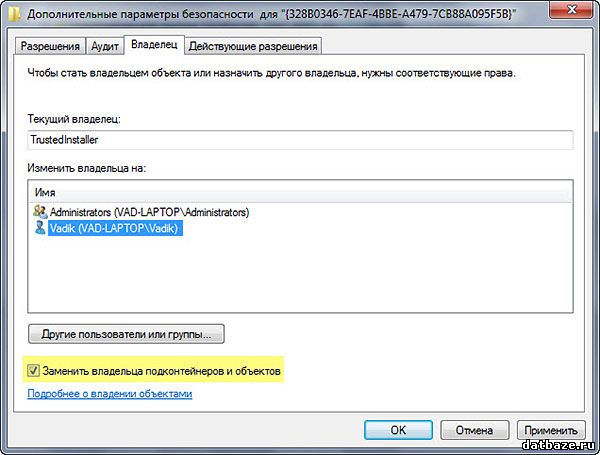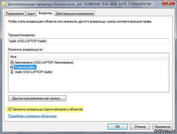 - Если владелец "TrustedInstaller” или "Система”, следует выделить свою учетную запись и, установив флажок "Заменить владельца подконтейнеров и объектов” нажать на кнопку "ОК”.