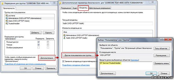 3. Нажав на кнопку "Дополнительно” откройте вкладку "Владелец”. В этой вкладке, в списке отсутствуют служебные учетные записи TrustedInstaller и Система. Они добавляются в список таким способом.