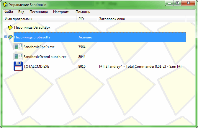 Запущенный в песочнице, Total Commander, отображается в цветной рамке. Для проверки откроем окно программы Sandboxie и проверим состояние песочницы. Как видно на скриншоте Total Commander запущен в виртуальной песочнице.
