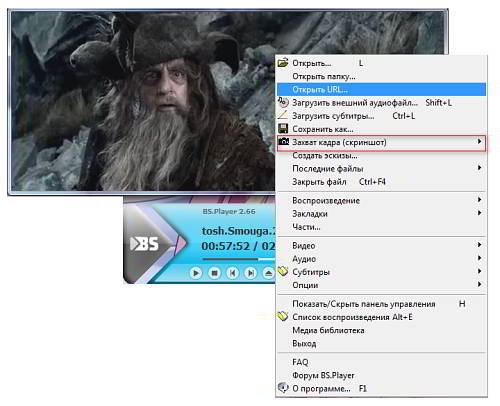 Скриншот можно слетать так же с помощью знаменитого видео проигрывателя BSplayer'e