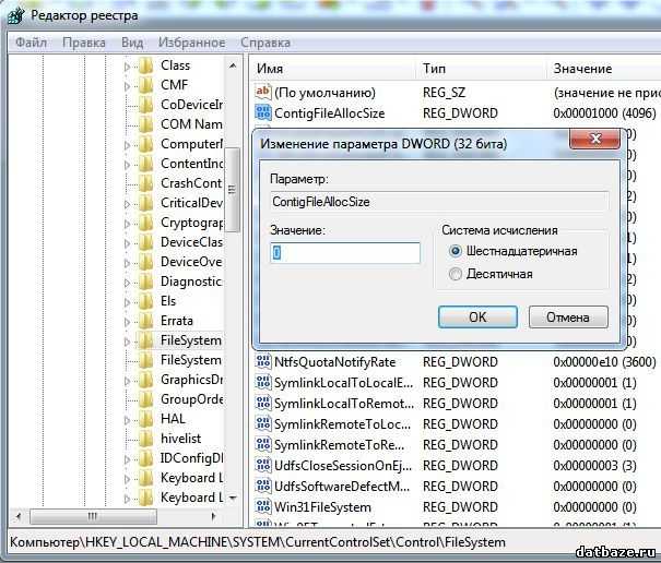 2. При отсутствии искомого параметра, создайте его самостоятельно. параметр ContigFileAllocSize (тип REG_DWORD (32 бита)).