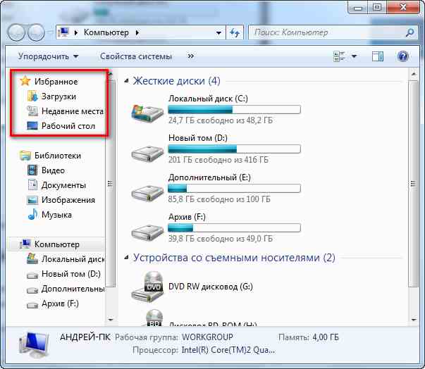 По умолчанию в разделе "Избранное" помещены папки: "Загрузки", "Рабочий стол" и "Недавние места".