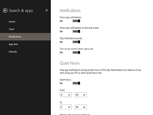 Горячими уведомлениями в Windows 8.1 называются уведомления, которые раскрываются в верхнем правом углу Вашего экрана. В зависимости от установленных приложений, они могут стать навязчивыми, но в Windows 8.1 есть несколько способов управления ими. Первый метод временно их приостанавливает. Откройте чудо-кнопки «Настройки», и в нижнем правом углу экрана щелкните по значку «Уведомления». Здесь можно скрыть горячие уведомления на 1, 3, или 8 часов.