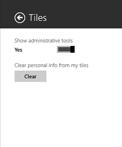 Чтобы отобразить на стартовом экране административные инструменты откройте чудо-кнопку «Настройки» (со стартового экрана, с рабочего стола не работает). В верхнем правом углу экрана Вы увидите плитку; щелкните по ней.