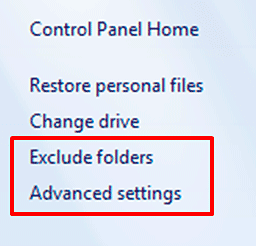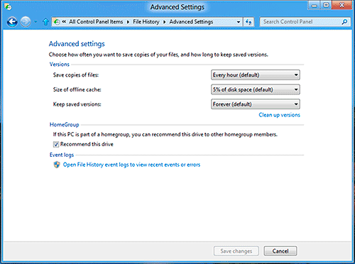 Дополнительные параметры находятся «Панели управления» приложение «История файлов».
