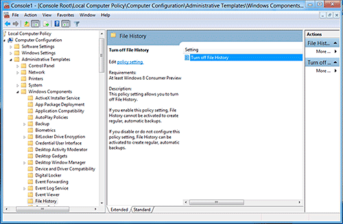 Политику истории файлов можно настроить через редактор объектов политики групп. Добраться до него можно так: «Конфигурация компьютера» - «Административные шаблоны» - «Компоненты Windows» - «История файлов».