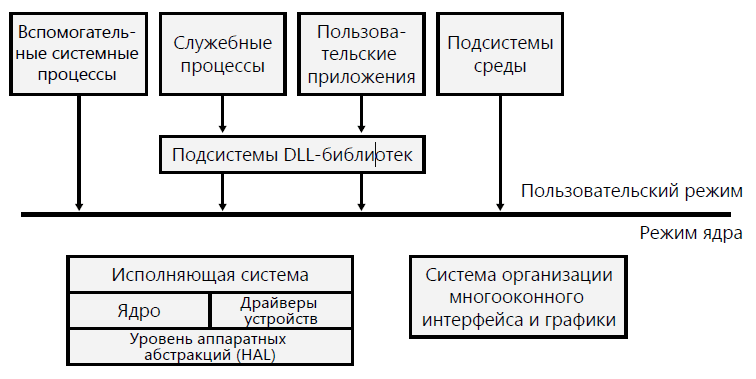 В первую очередь на рисунке нужно обратить внимание на прямую линию, разделяющую части операционной системы Windows, работающие в пользовательском режиме и в режиме ядра. Прямоугольники, находящиеся выше линии, представляют процессы, идущие в пользовательском режиме, а компоненты, показанные ниже линии, представляют системные службы, работающие в режиме ядра.