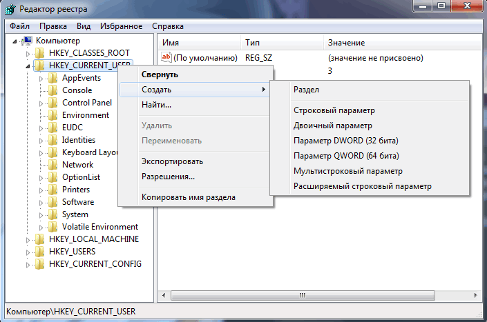 Далее следует выбрать значение соответствующего типа (строковый, двоичный параметр, DWORD…). Этот параметр выбирается в зависимости от конкретного случая.