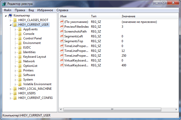 HKEY_CURRENT_USER. Включает в себя все используемые в это время конфигурации пользователя Windows.