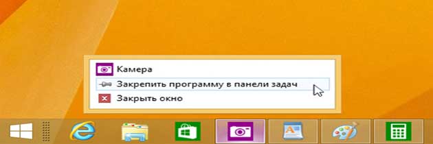 Панель задач в Windows 8.1 аналогична панели задач Windows 7. Здесь можно закрепить программы, которые потом запускать одним щелчком мыши, или касанием и перемещением вверх (также как правой кнопкой мыши) открывать список операций с дополнительными опциями.