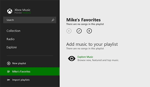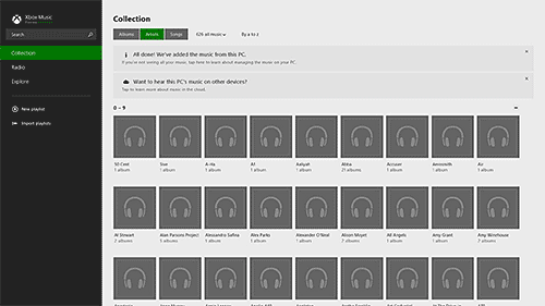 В верхней левой части приложения находятся ссылки для проигрывания музыки с Xbox Music Radio и обозрения доступных к покупке онлайн в этом сервисе музыкальных и видео новинок.