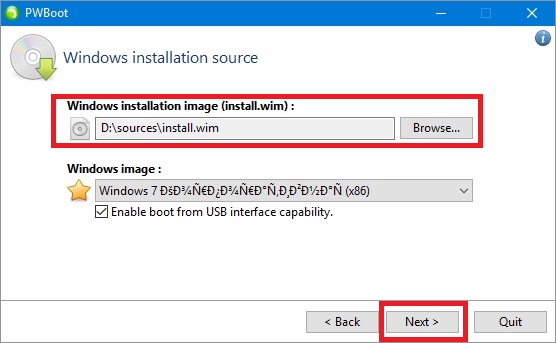 В появившемся окошке утилиты кликните на первый раздел и выберите «Next». Здесь утилита попросит вас выбрать файл «install.wim». В нашей ситуации используется файл из диска установки Виндовс 7.