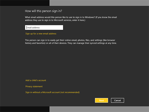 Подсказка. Если Вы создаете учетную запись за другого уже имеющего учетную запись Microsoft человека достаточно просто ввести адрес его электронной почты. ПК не будет запрашивать пароль до его первого входа в систему.