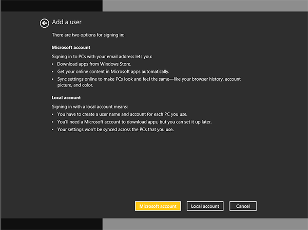 Внимание. Так, чем отличается локальная учетная запись от учетной записи Microsoft? У локальной учетной записи есть явные преимущества, если Вы используете только один ПК, в котором все сохранено локально, нет ничего в облаке, и Вы обеспокоены конфиденциальностью. Однако, в этом случае невозможно использовать Windows Store и Ваши настройки не будут синхронизироваться с другими ПК.
