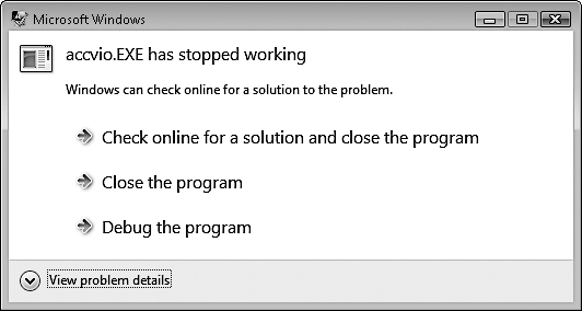 При щелчке на пункте отладки (Debug) будет запущен отладчик (зарегистрированный в строке Debugger, рассмотренном ранее параметре AeDebug), чтобы подключиться к аварийному процессу.