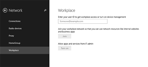 Если Вы используете свой ноутбук Windows 8.1 или планшет на работе или ПК с Windows 8.1 был предоставлен Вашим работодателем, вероятно, вы должны соединиться с сетью этой компании (сервером). Однако возможно иногда Вы захотите использовать на работе свой собственный компьютер. Для таких целей Microsoft предложила новую функцию под названием Рабочее место. Эта функция позволяет отделу ИТ предоставить своим сотрудникам и их компьютерам определенные сетевые права доступа, не соединяя их непосредственно с сетью компании.