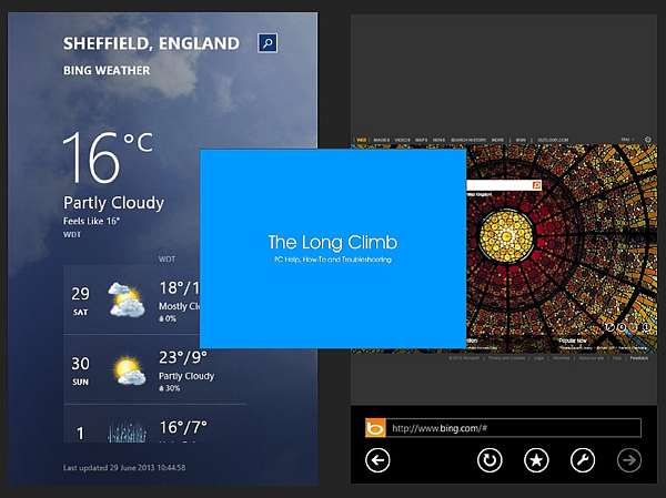 Если Вы запускаете третье или даже четвертое приложение (хотя здесь требуется более высокое разрешение экрана), оно появляется как миниатюра между двумя прикрепленными в настоящий момент приложениями. Это может сначала путать, но здесь - работает.
