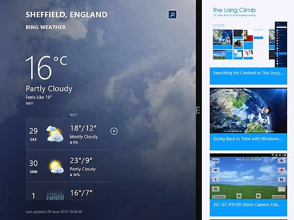 По умолчанию, каждое работающее в Windows 8.1 приложение, занимает целый экран, хотя имеется возможность иметь два или больше работающих рядом приложений. Когда Вы одновременно запускаете больше чем одно приложение, каждое из них занимает 50 процентов экрана. Такое расположение можно изменить перетаскиванием появляющейся между ними панели ползунка, большое разрешение экрана может позволить отображение до четырех рядом работающих приложений. Это позволяет Вам использовать основное приложение рядом с другим приложением.