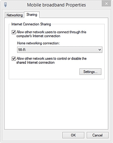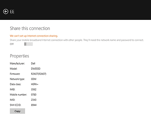 Если ваше мобильное широкополосное соединение может быть совместно использовано, будет активна кнопка «Поделиться». Так бывает не всегда потому, что объект может быть отключен от мобильной сети. Совместно использованное подключение, устанавливает специальную Wi-Fi сеть с собственным названием и кодом доступа, к нему вы можете подключить до десяти устройств любого типа. То есть, вы не ограничены только компьютерами под Windows 8.1. Любое устройство, которое можно подключить к Интернету через Wi-Fi, может использовать эту сесть.