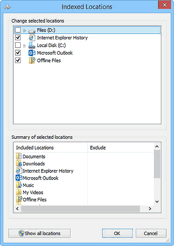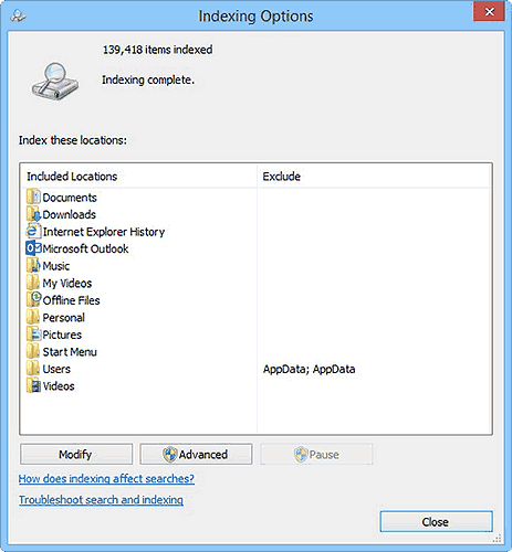 Причина быстрой работы поиска в Windows 8.1, по крайней мере для внутренней памяти компьютера, состоит в том, что все подробности о файлах сохранены в индексной базе данных. По умолчанию, эта база данных хранит информацию о чем-либо в Ваших пользовательских папках и библиотеках. Причем папки (или даже все жесткие диски) в индексе можно переместить, добавить, или удалить.