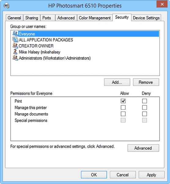 Здесь вы можете внести свои изменения, в том числе дать какому-либо пользователю разрешение на управление заданиями печати (например, удалить задание).
