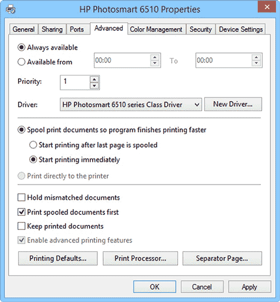 - Возможность выбора приоритетности заданий на печать: возможно, Вам потребуется включить эту функцию, чтобы принтер начинал новое задание только после окончания предыдущего (если принтер имеет маленькую внутреннюю память). Как правило, Windows 8.1 и сама отлично управляет заданиями на печать.