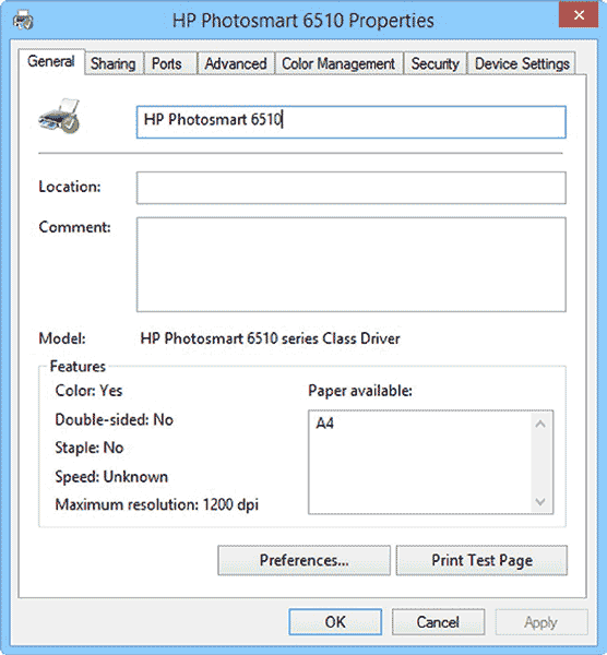 В основном диалоговом окне свойств принтера, вкладка "Общие", отображается имя принтера (которое можно изменить, введя новое имя). Здесь же Вы можете ввести комментарии о локации машины, и оставить заметки (возможно, о том, как вставить бумагу для двусторонней печати).
