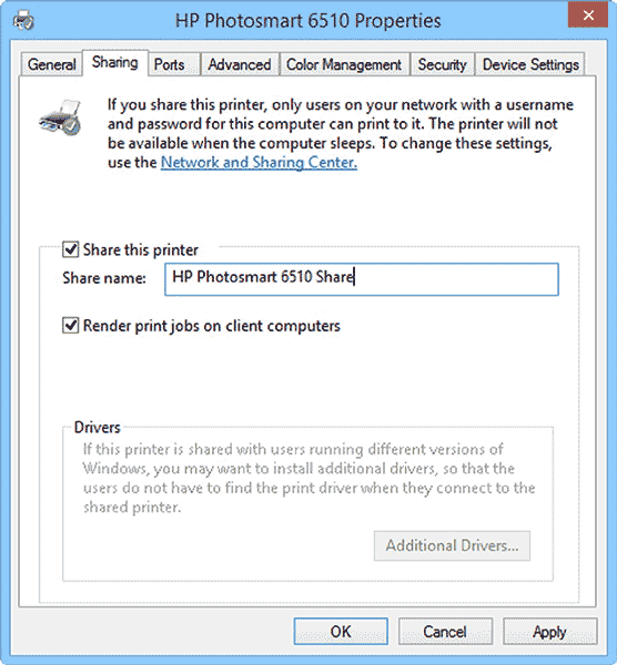 К общим принтерам могут обращаться и компьютеры под управлением других версий Windows, таких как Windows 7, Windows Vista или Windows XP. Если это так, нажмите кнопку "Дополнительные драйверы" и выберите драйверы, которые по мере необходимости загрузятся автоматически.