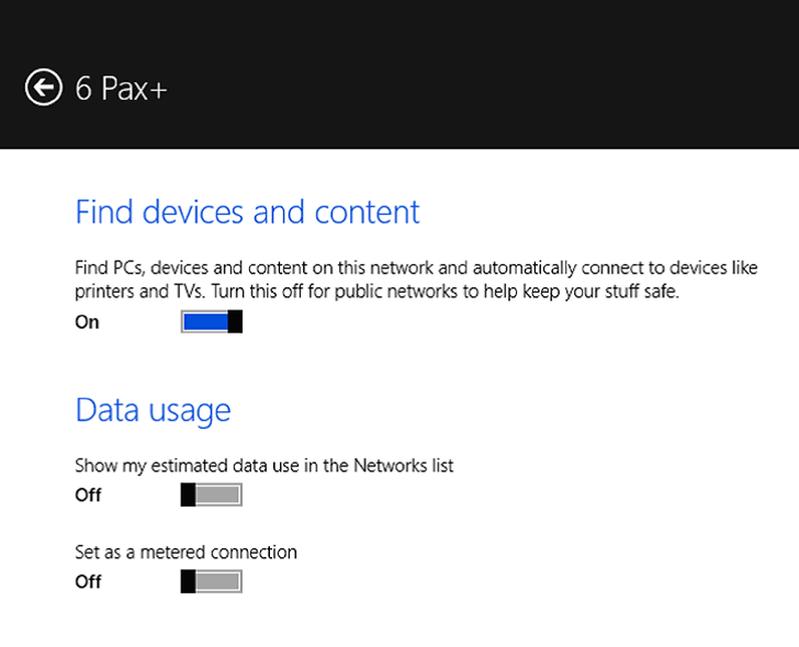 - В разделе Data Usage (использование данных), переключите переключатель под "Отображать мое использование данных в списке сетей" и, дополнительно, можно отметить чтоб Windows 8.1 обрабатывал эту сеть как измеряемое соединение. Эта установка препятствует отправлению и получению Windows и Вашими приложениями слишком большого объема данных, что спасает от чрезмерных затрат по трафику.