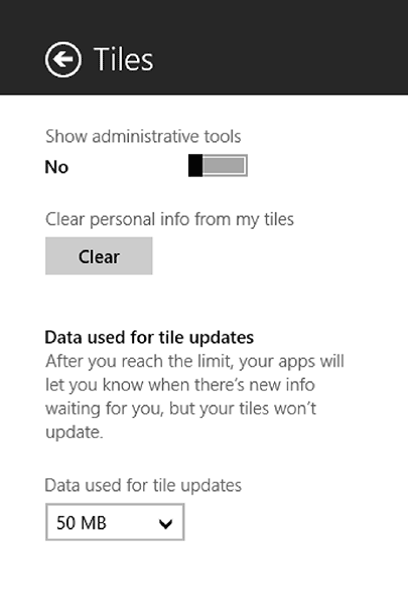 Окно плиток позволяет Вам определять максимальный объем данных, который живые плитки могут использовать в течении месяца. Как только этот предел достигнут, живые плитки по мобильному широкополосному соединению больше обновляться не будут.