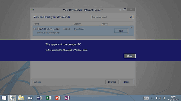 Как обычно Вы можете установить программное обеспечение на компьютер с помощью CD или DVD диска с инсталлятором программного обеспечения или запустив с флэшки или другого внешнего диска через проводник. Вы не можете установить настольное программное обеспечение на компьютере под управлением Windows RT из-за принципиальных различий в процессах использования окон в Windows 8.1 на ПК и устройствах Windows RT. Попытка установить настольную программу в Windows RT выдает ошибку.