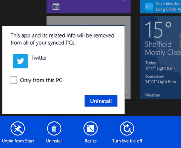 Чтобы удалить приложение (и установленное на компьютере программное обеспечение) со стартового экрана, щелкните правой кнопкой (коснитесь и удерживайте), на приложении и выберите "Удалить с панели приложений".