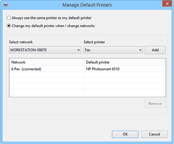 Не беда, Windows 8.1 позволяет установить принтер по умолчанию для той сети, с которой Вы в это время соединены. В "Устройствах и принтерах" выберите свой принтер и затем щелкните по "Управлять принтерам по умолчанию" на панели инструментов вверху окна.