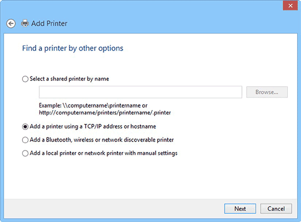 При прочих равных условиях, скорее всего IP-адрес или сетевое имя принтера Вы не знаете. Самый быстрый способ решения этой задачи - посмотреть конфигурацию принтера на другом компьютере. Это можно сделать в "Устройствах и принтерах" (в Windows 7 и Windows 8.1). Щелкните правой кнопкой по нужному принтеру и выберите "Свойства принтера". Под вкладкой "Порты" Вы увидите адрес принтера.
