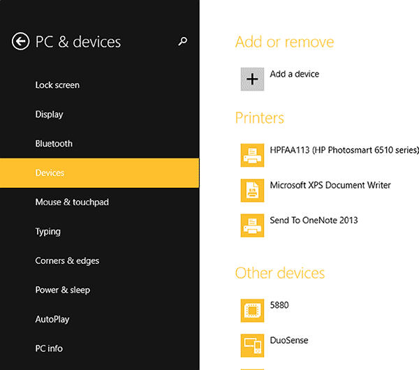 Однако, Windows 8.1 не сможет установить принтер, если драйвера к нему не включены в Windows 8.1 или не доступны на Windows Update. В таком случае необходимо удалить и переустановить принтер. В Windows 8.1 имеется два основных способа установки принтеров и других устройств, самый простой из которых – использование настроек ПК. Откройте панель "Настройки ПК" и перейдите к "ПК и устройства", затем "Устройства". Здесь Вы увидите список всех установленных устройств, но вверху окна имеется кнопка "Добавить устройство". Щелчок или касание этой кнопки запускает автоматическое обнаружение Windows 8.1 новых аппаратных средств.