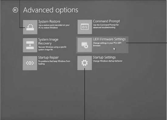 Настройки прошивки UEFI (UEFI Firmware Settings) Запускает программу установки прошивки UEFI (BIOS) Запускается из "Дополнительных параметров" (Advanced Settings)