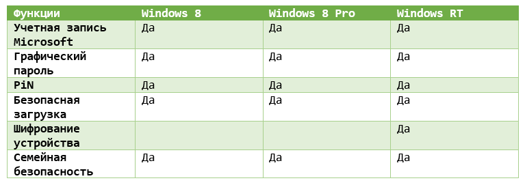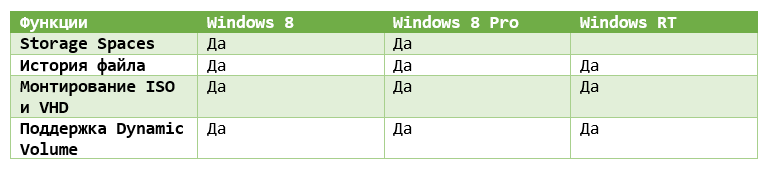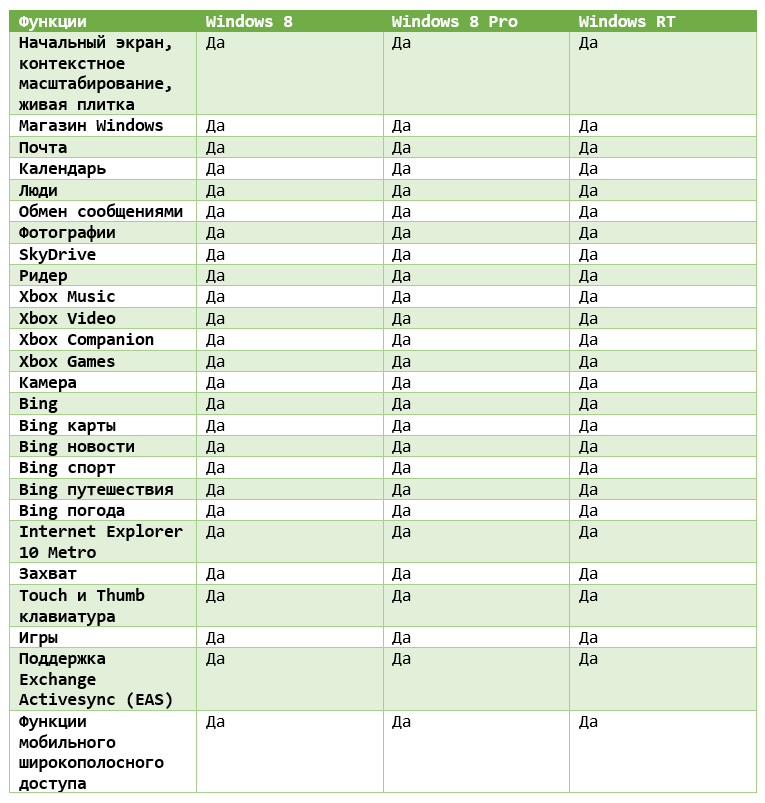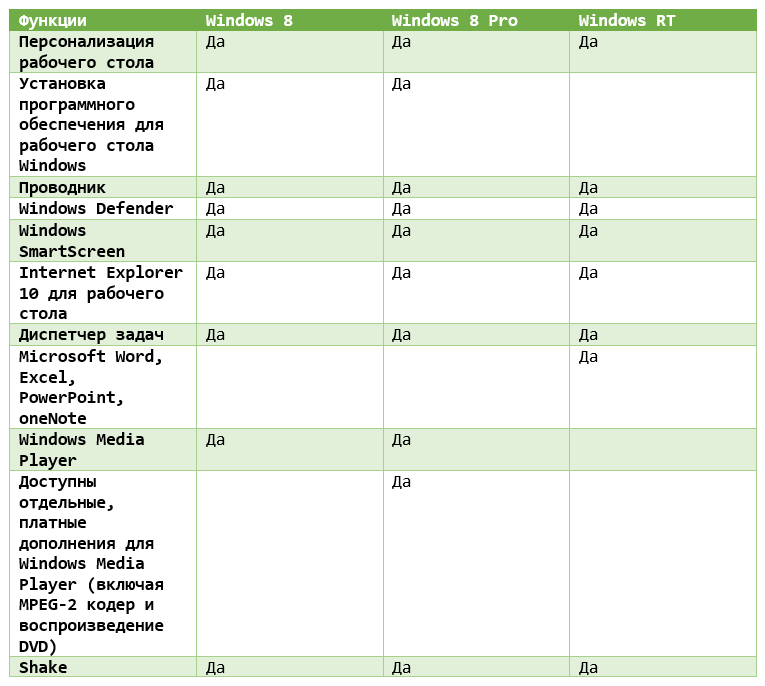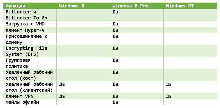 Кроме базовой архитектуры, все остальные редакции Windows 8 примерно сопоставимы Windows RT. То есть наборы функций в них очень похожи. Профессиональная Windows 8 представляет собой расширенную Windows 8, где к стандартным компонентам Windows 8 добавлено несколько уникальных особенностей. Грубо говоря, ОС Windows 8 ориентирована на обычного потребителя — как раньше Windows XP Home — а Windows 8 Pro - ориентирована на компании и просто энтузиастов, как была XP Professional.