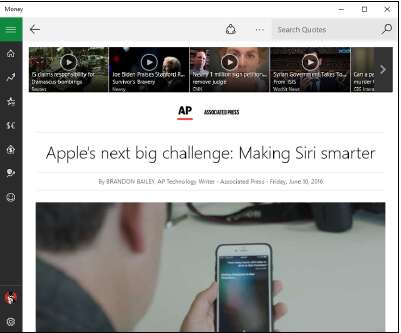 • Вернувшись на главный экран «Windows Money», коснитесь или щёлкните передовую статью или одну из других статей, которые вы можете увидеть, прокрутив страницу вниз. Вы увидите презентацию, идентичную той, что видите в приложении News. Страницы нельзя сжимать, чтобы изменить размер текста, но можно смахивать, чтобы перемещать страницы. Немного поперемещайтесь, и вы освоитесь.