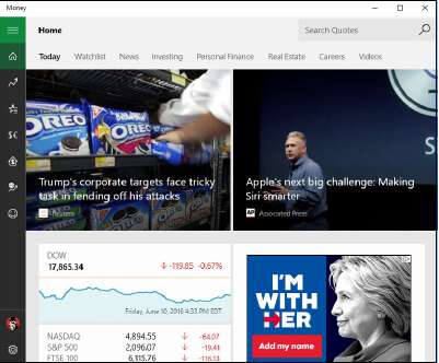 • В меню «Пуск» коснитесь или щёлкните плитку «Деньги». Как и приложение Windows News, приложение Money открывается с великолепными фотографиями высокой чёткости. Но есть, также, плитки с котировками акций и рекламой. Опять же, если вы новичок в приложении, вы можете получить подсказки для персонализации и предупреждения. Если рынки открыты, внизу изображения, вы также можете увидеть тикер основного индекса США.