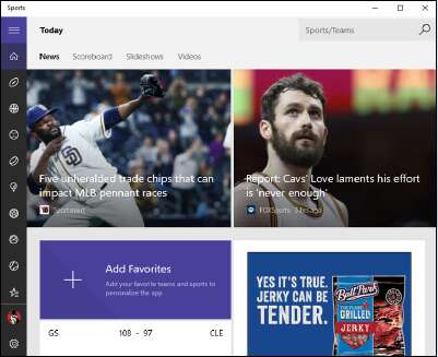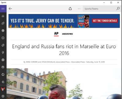 Из трёх, управляемых Bing, приложений Windows Sports неизменно получает самые высокие оценки. Как и в других случаях, когда вы открываете приложение, вы увидите плитки с текущими историями, сопровождаемыми великолепными фотографиями с высоким разрешением. Вы также получаете рекламу. Удивительно, да?
