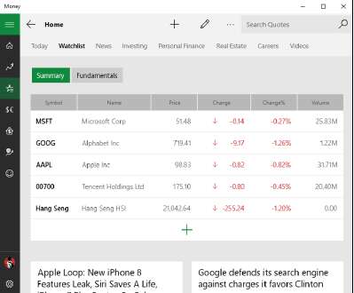 Windows Money и Windows Sports. В отличие от приложения Windows News, приложение Windows Money не имеет серьёзных проблем с удобством использования. Ну, да, вы не можете растянуть, чтобы текст выглядел больше. Он тяжёл для американских фондовых бирж и мало освещает новости за пределами Соединённых Штатов. Но в остальном Windows Money вполне пригодна для использования — у неё даже есть отличный международный список наблюдения.