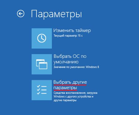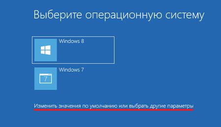 Вариант второй: Его можно использовать при первичном запуске системы, когда у вас установлено две системы. В окне для выбора системы загрузки выберите "Изменить значения по умолчанию или выбрать другие параметры"