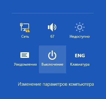 Вариант первый: После полной загрузки системы, выберите в правом, нижнем углу экрана пункт "Параметры" или нажимаем горячих клавиш - Win+I. В открывшемся меню нажмите на значок "Выключение".